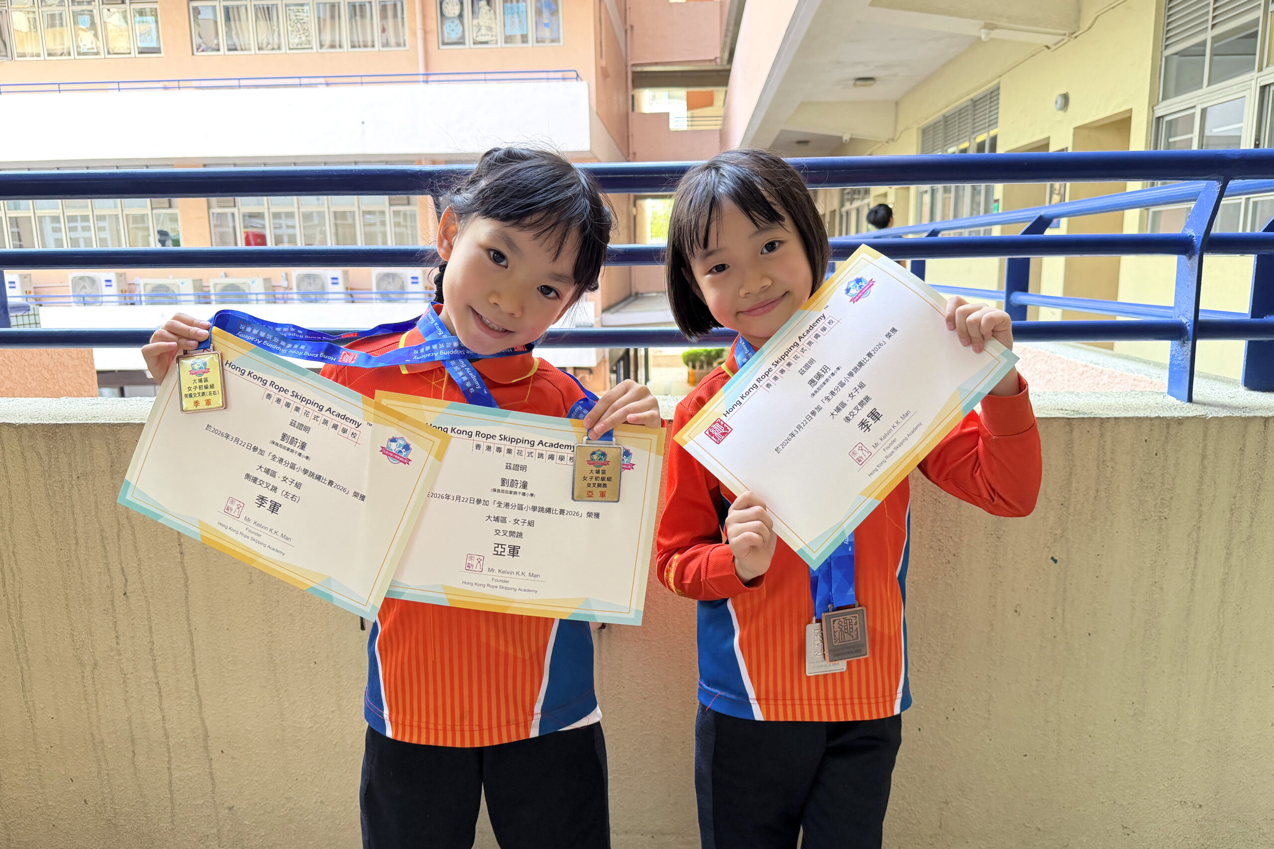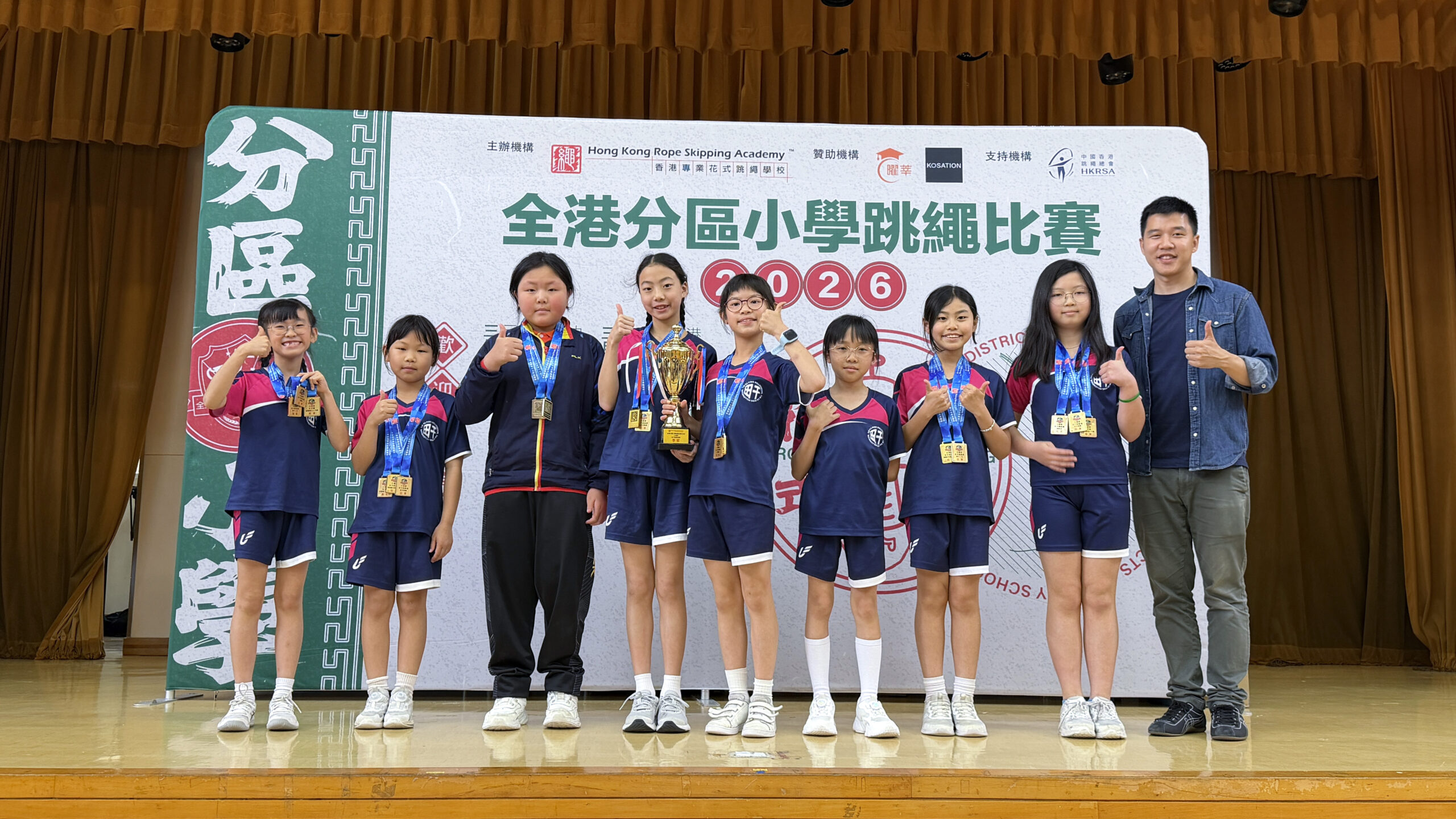 本校花式跳繩校隊日前參加了2026全港分區跳繩比賽(大埔區),所有隊員全力以赴,以堅毅的精神努力作賽,共獲得17冠17亞18季10殿的優異成績,並且獲得男子組全場總殿軍及女子組全場總季軍,成績令人鼓舞。